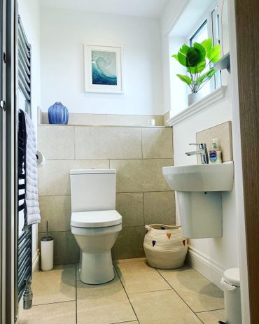 Downstairs, we have a second toilet with basin, mirror and heated towel rail.