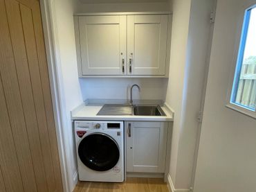 The utility room has a large capacity washer/dryer and basin.
